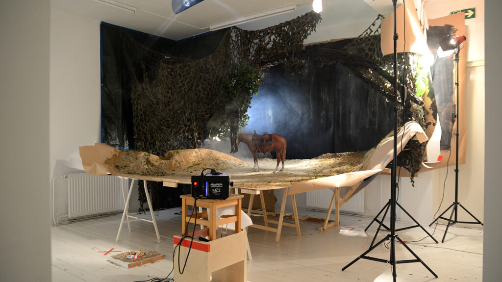 An installation consists of studio sets in which Frank&Michiel deconstruct the commercial image by re-enacting stereotypes, confronting their audience with a reality that constantly exceeds the ‘real’ reality. After a one month artist-in-residence program, Frank&Michiel have developed new works in which they examine contrasts between fiction and reality, universal and cliché, and art and entertainment. Have you ever wondered about becoming the new face of Chanel? Have you ever wondered how the cowboy must feel whilst smoking a Marlboro cigarette? These questions will be central to the research on the communicative role of imitation within our contemporary visual culture and how this influences our society.